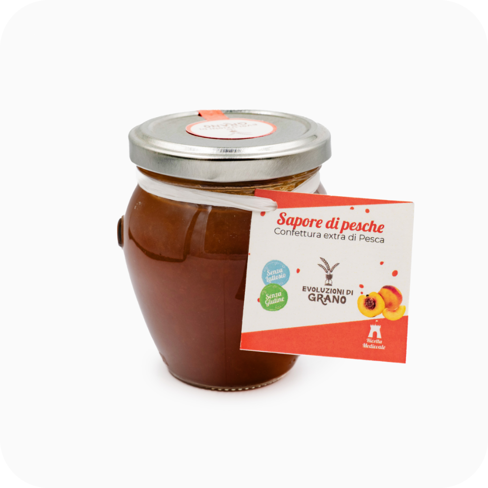 Confettura di pesche, aromatizzata con succo e scorza di limone, addolcita e